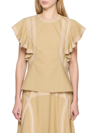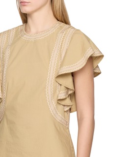 This Ulla Johnson top exudes feminine charm with its delicate mustard hue and meticulous embroidery detailing. The ruffled cap sleeves add a touch of whimsy, while the scalloped trims along the neckline and seams infuse it with refined elegance. Crafted from a lightweight fabric, it promises breathability and comfort.