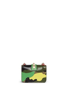 Taking in the extraordinary vision of Valentino's heritage label status, this 'Camupsychedelic' chain bag makes a practical style statement. Wildly inventive with a khaki green canvas body and colourful leather appliqués further accentuated with macro Rockstuds, this classic design tunes into the season's colourful palette, making it a must-have collectible for your handbags arsenal.