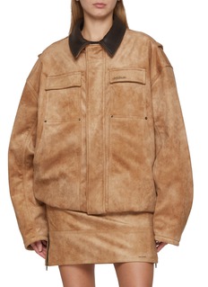 Borrowing cues from utility outerwear, this oversized WE11DONE jacket is cut from supple suede with a contrast collar that sharpens its proportions. Flap chest pockets and concealed front fastening keep the design streamlined, while its relaxed silhouette exudes effortless nonchalance. Layer it over tonal separates for a modern twist on workwear codes.