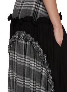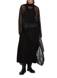 An ode to Y’s signature play between structure and softness, this skirt fuses masculine tailoring with poetic detail. The monochrome check contrasts against the flowing black fabric, while ruffled gathers trace the hips and seams, adding a sculptural rhythm. Perfect for layering with boots or relaxed knits for an artfully undone look.